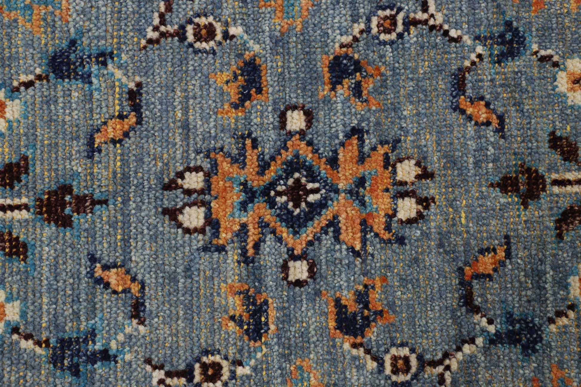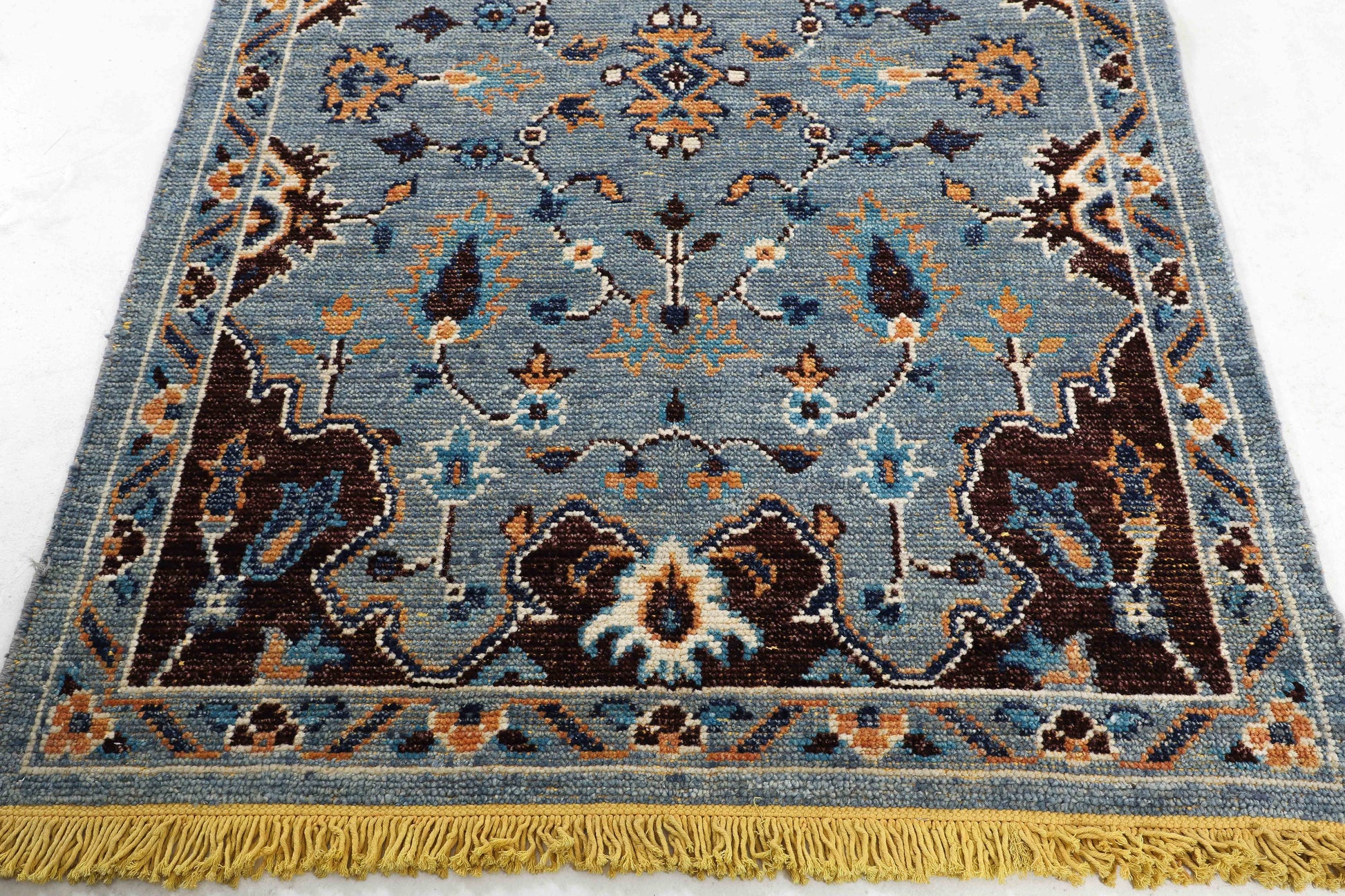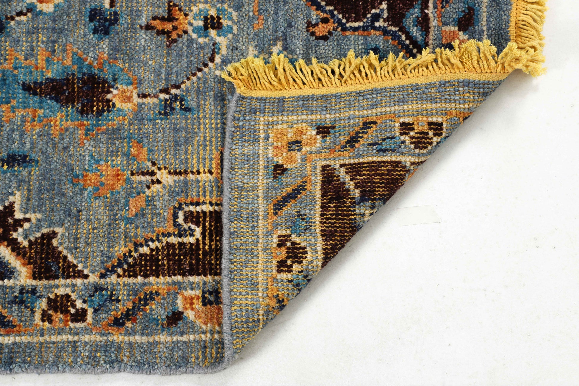 A meticulously hand-knotted rug in light blue with subtle yellow hints, bringing warmth, elegance, and a refined touch to your home.