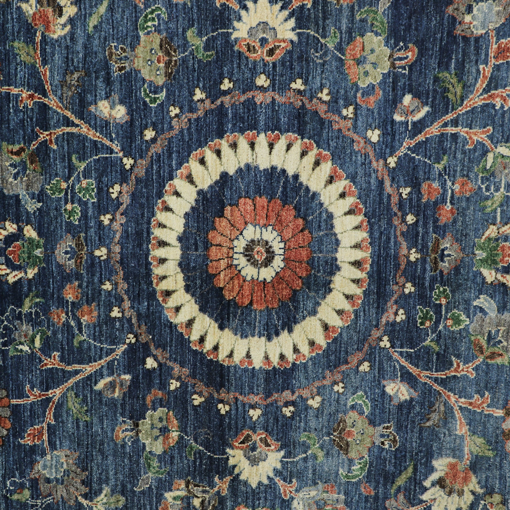 This hand-knotted rug in blue and ivory showcases tribal artistry with a modern touch. Crafted from 100% wool, its refined design and rich texture add depth and elegance to any space.