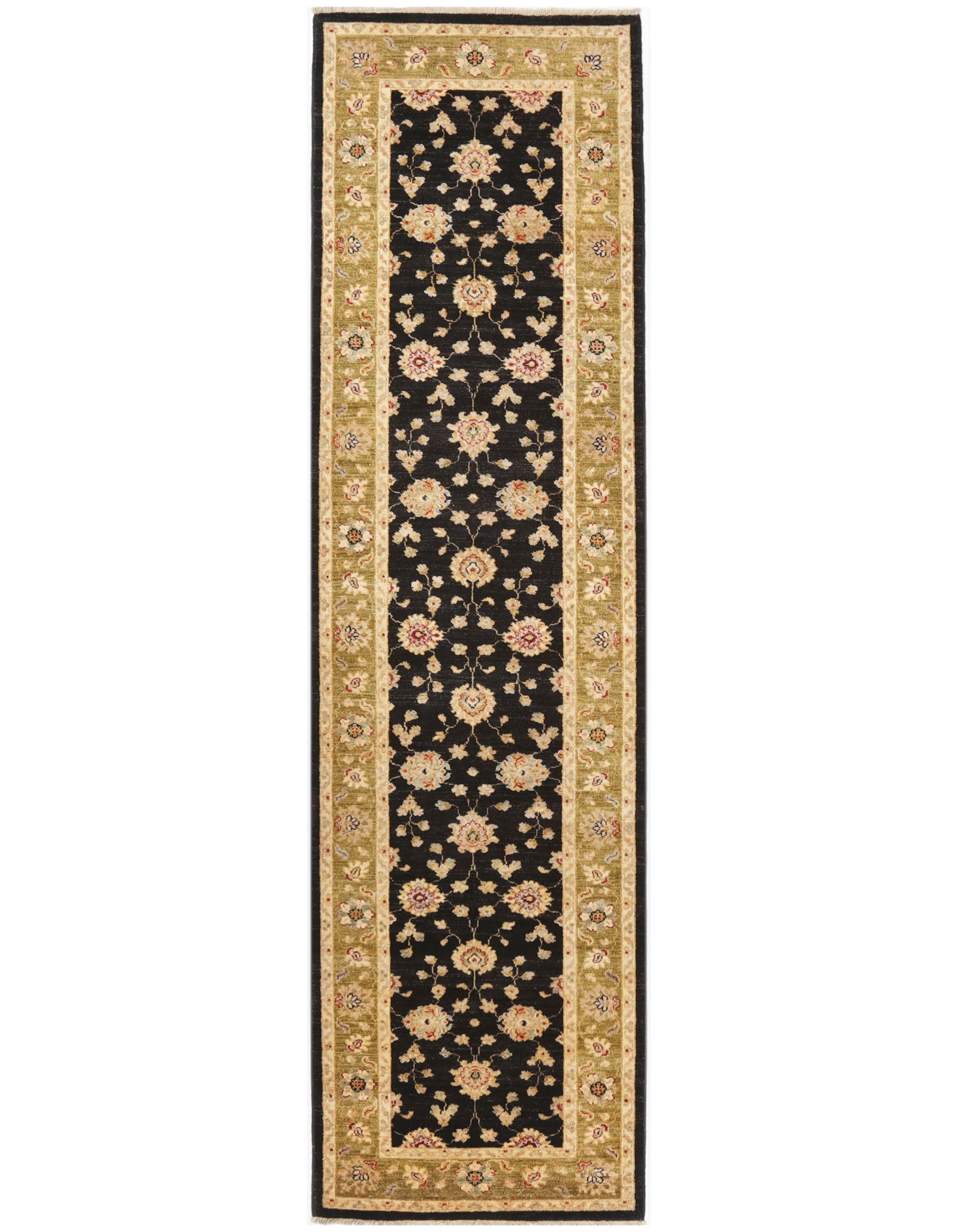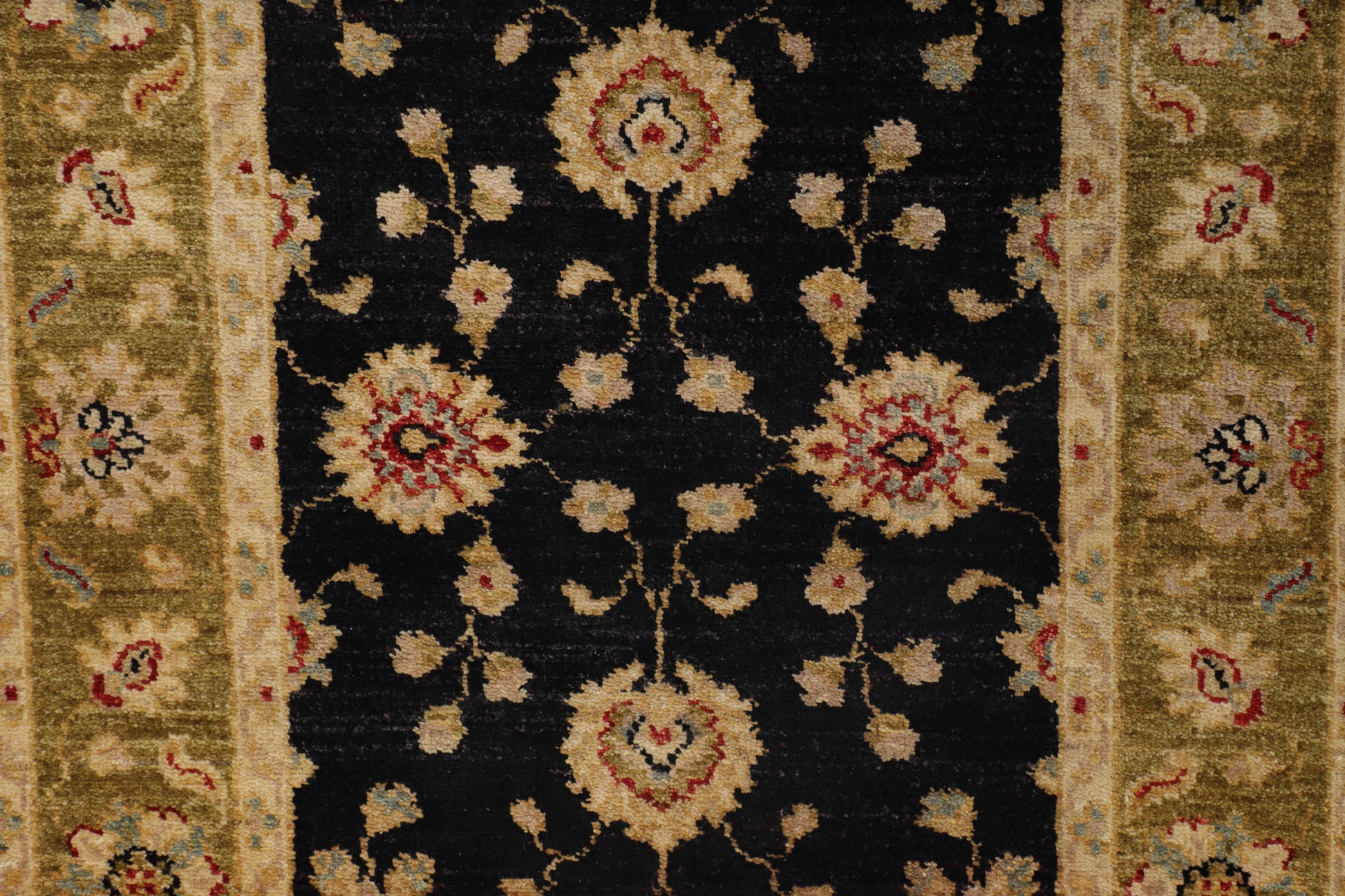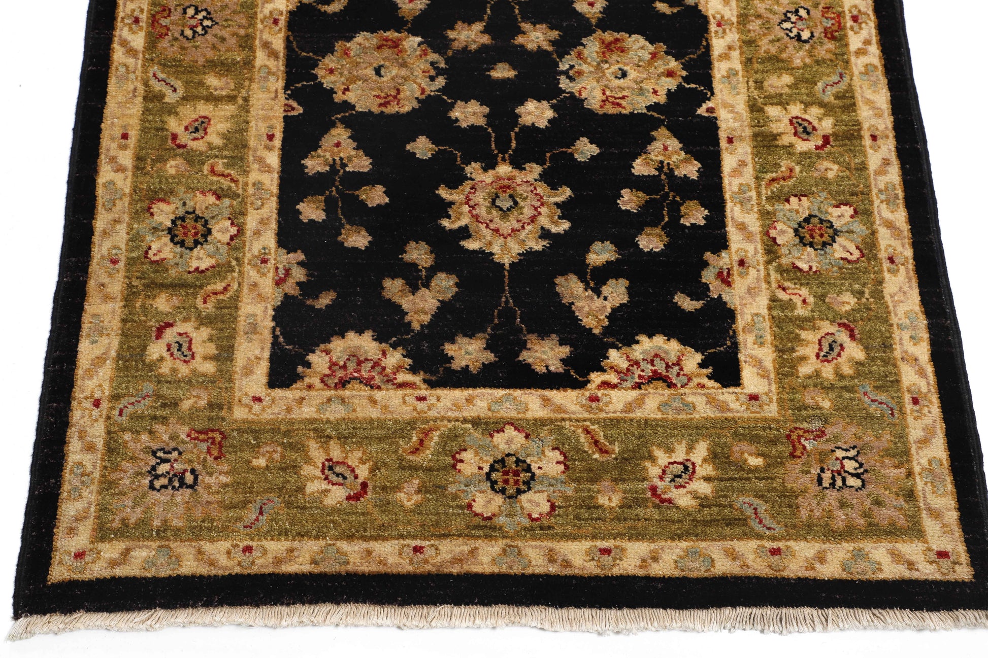Like a night sky touched by blooming florals, this black rug with ivory-red accents and an olive green border reflects a classy yet bold style.