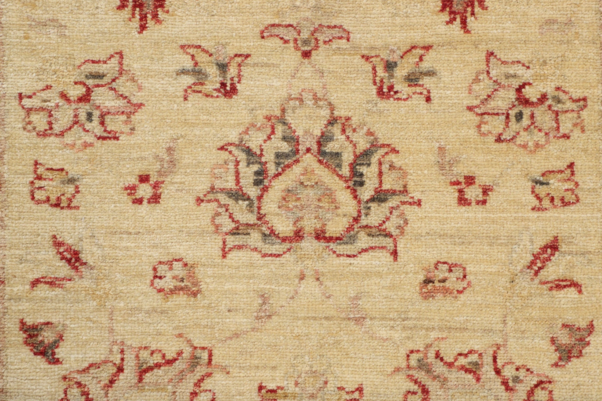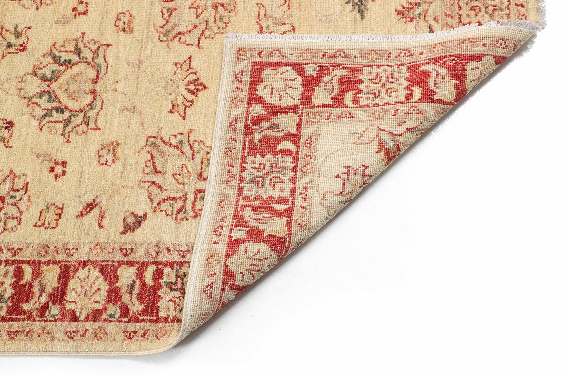 This contemporary handmade rug, with a gentle ivory-toned base and crimson red border, showcases a delicate texture that effortlessly enhances any room's beauty.