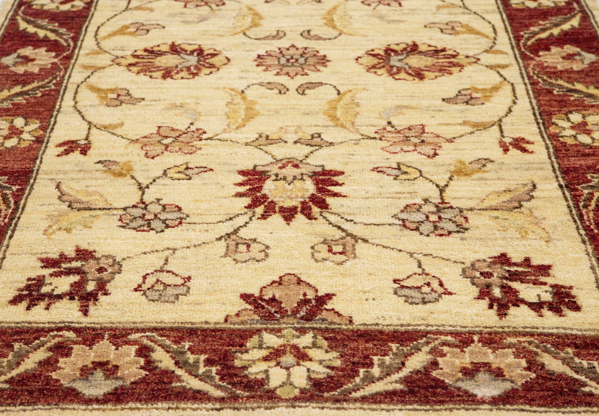 With its crimson red border and ivory-toned base, this handcrafted rug has a highly smooth texture that radiates modern elegance and subtle luxury.