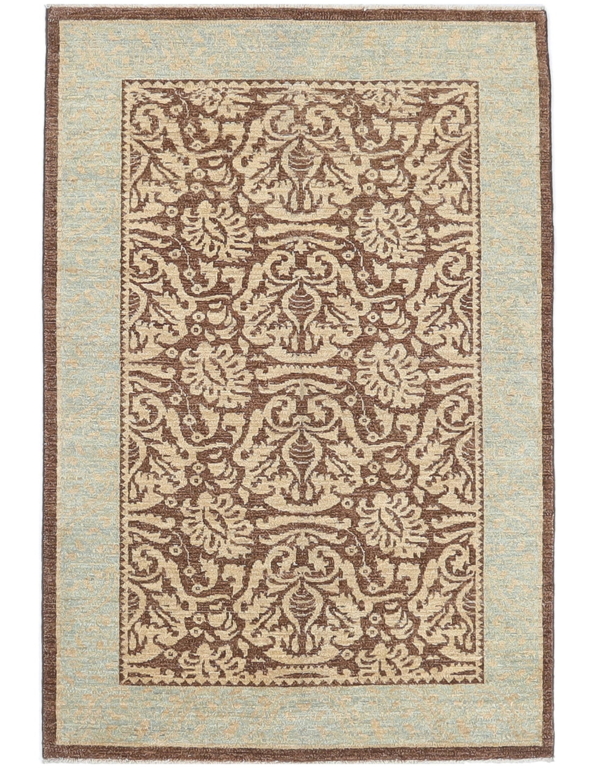 With its deep brown base and olive green edge bordered by lovely ivory texture. This handcrafted rug offers both richness and peace to any space.