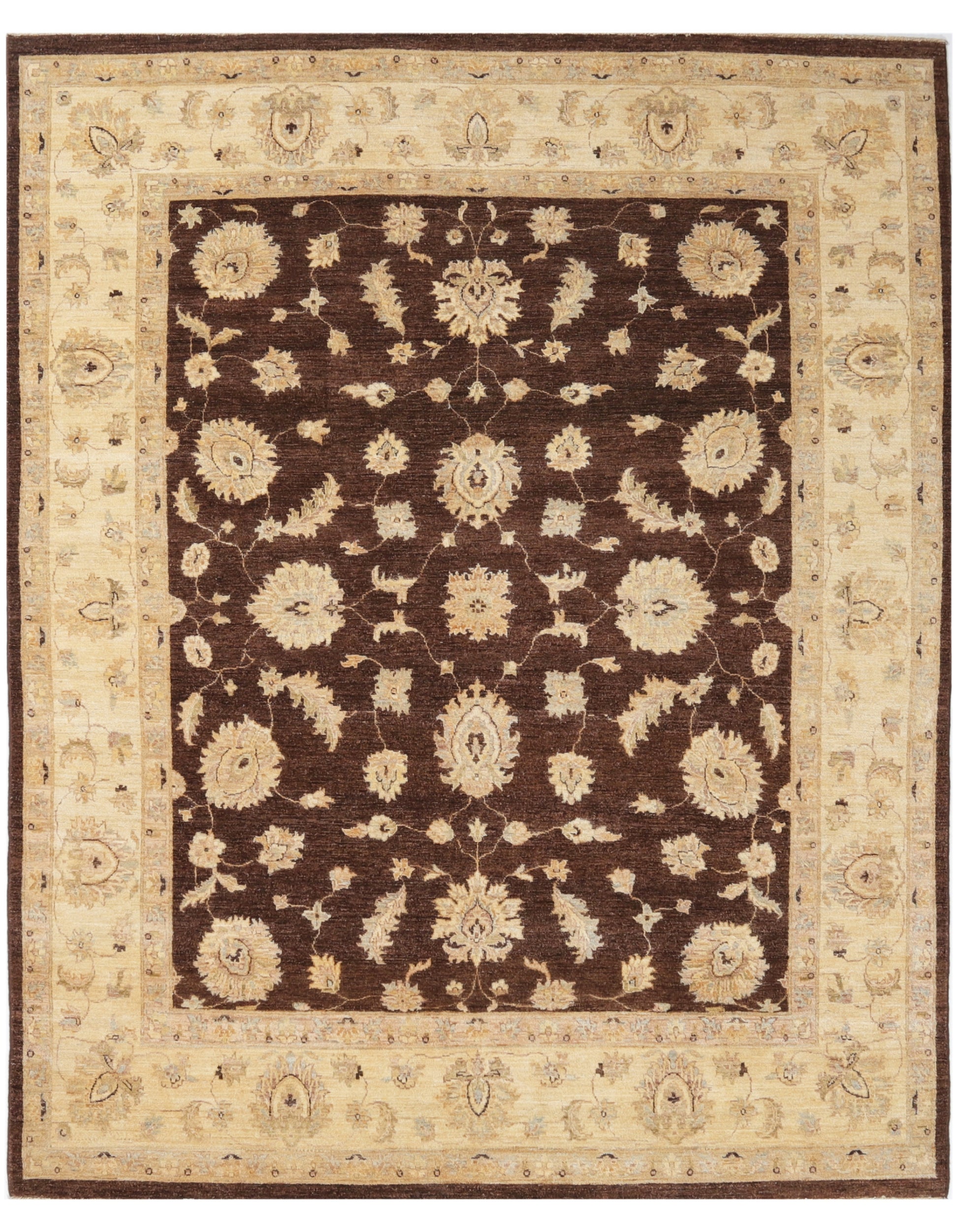 Deep brown base and an ivory-colored border with a complex texture, this handcrafted rug adds a beautiful fusion of subtle class and rustic charm to your residence.