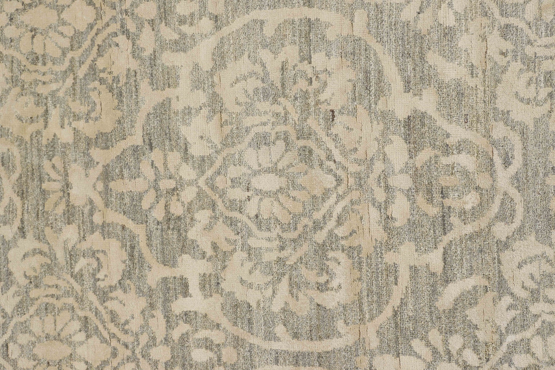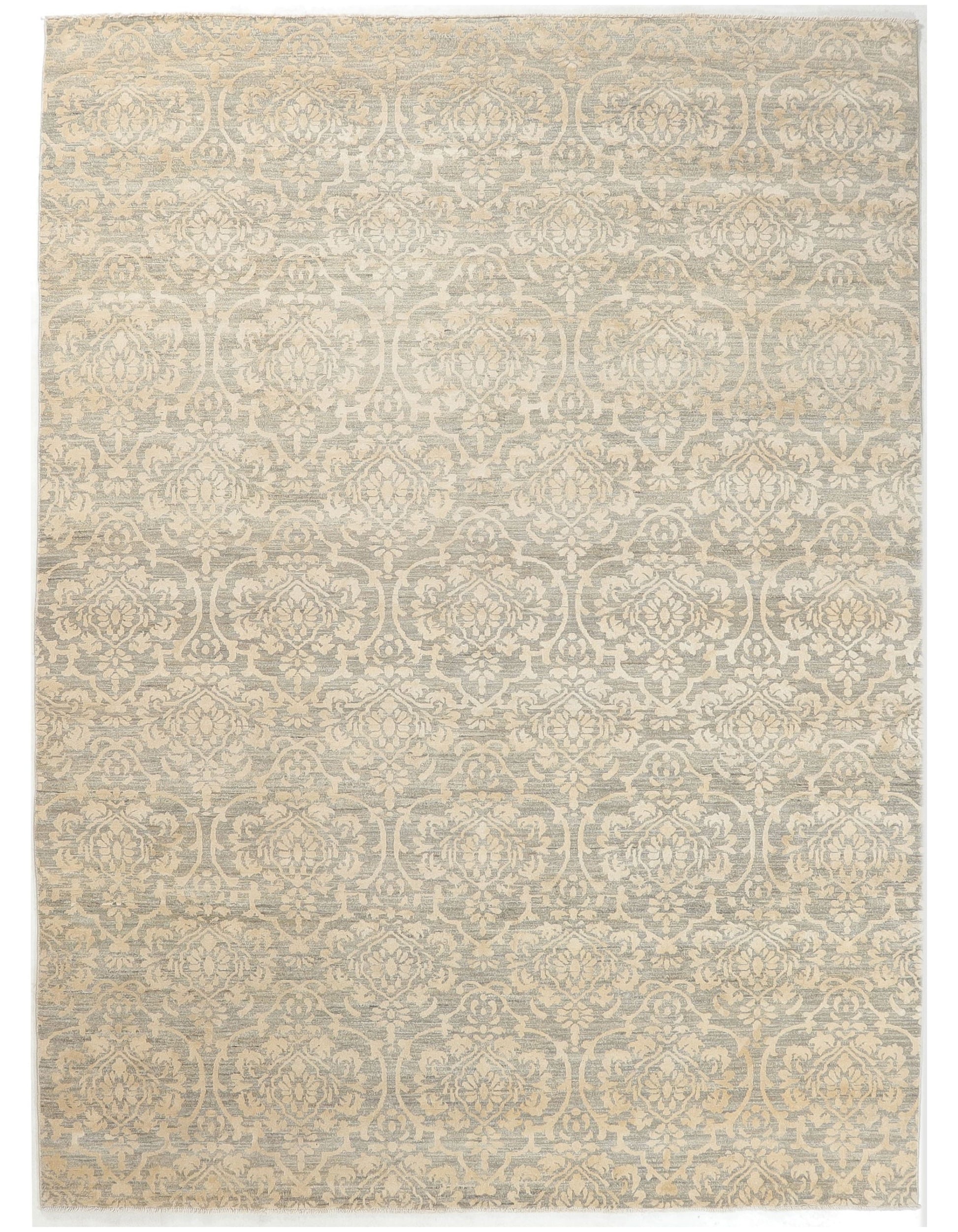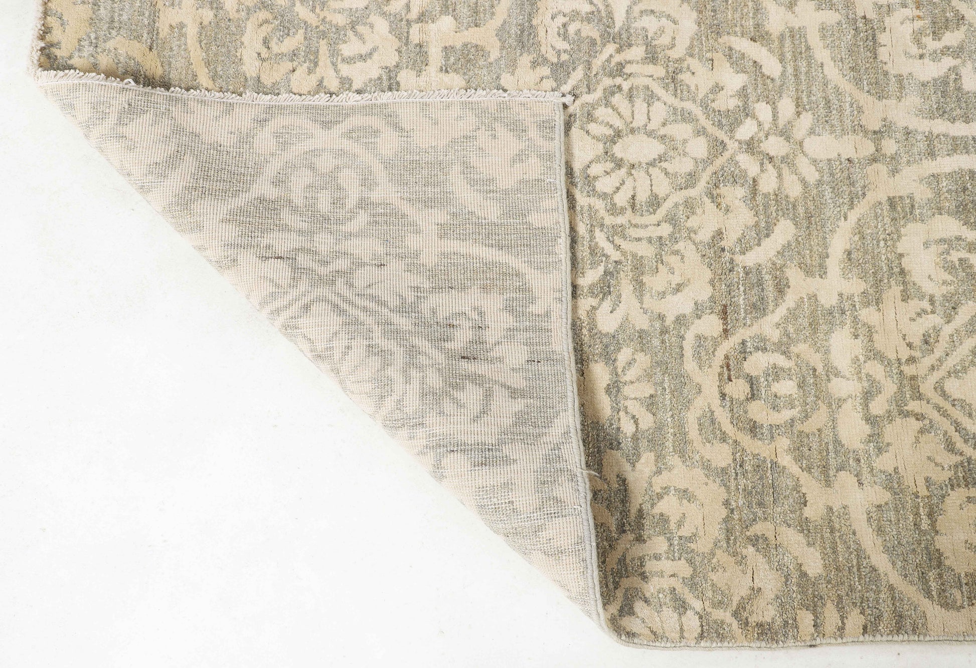 The calming ivory tones and soft skin texture of this handmade rug create a soothing atmosphere, blending elegance with quiet simplicity.