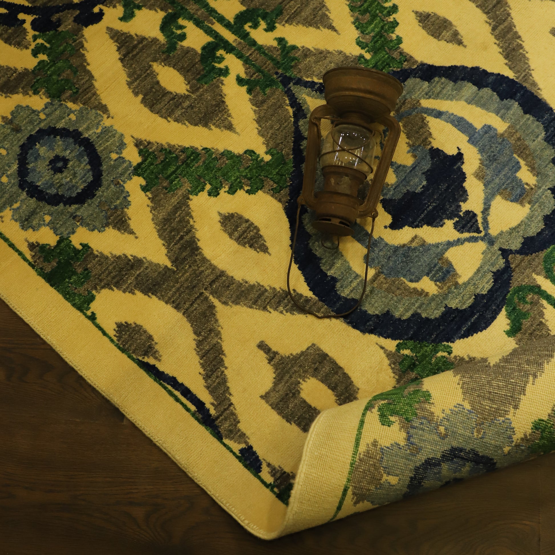 With its ivory base and olive green x ocean blue motifs, this handmade rug effortlessly blends chic elegance with vibrant charm to your space.