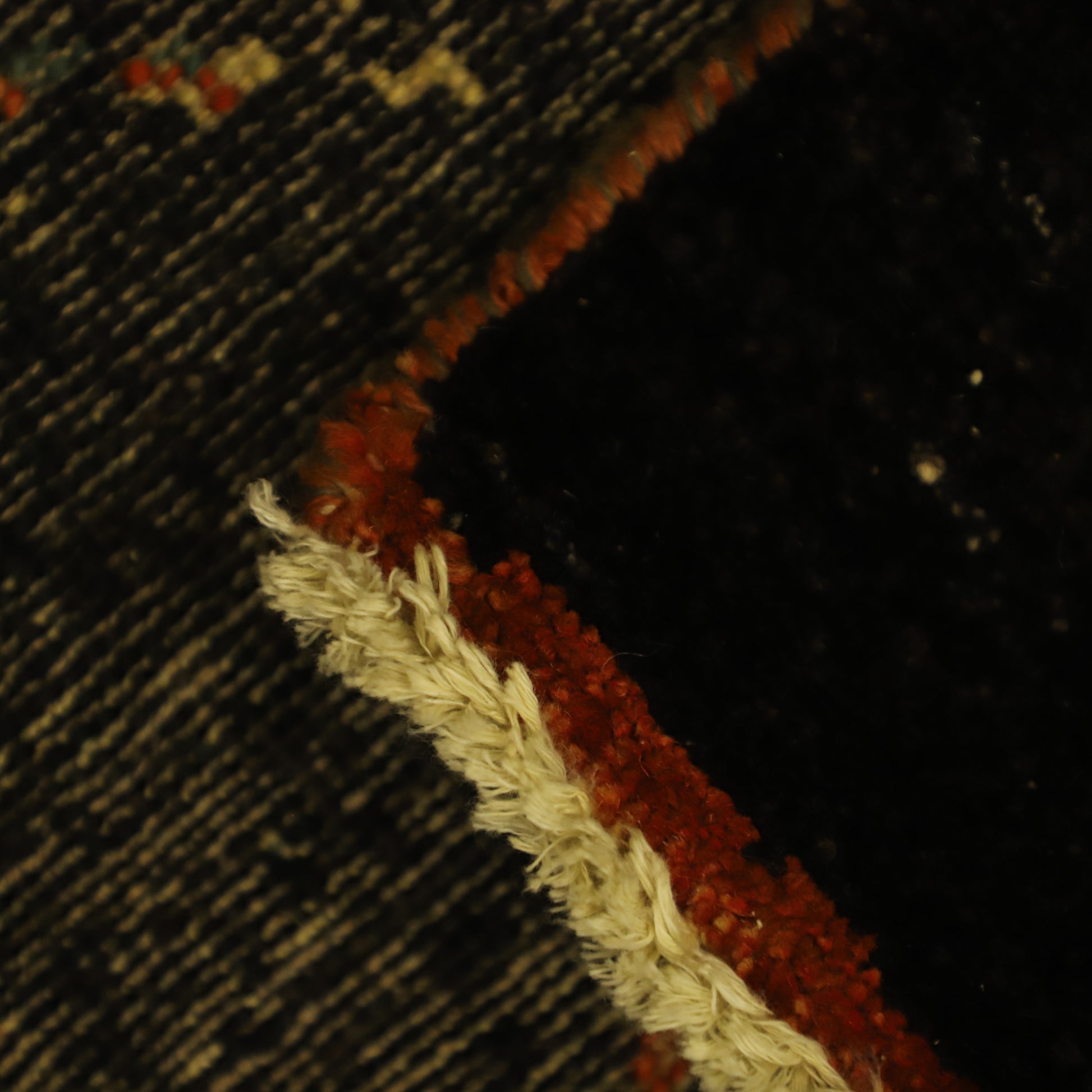 This handmade rug, with its deep black tones and striking red patterns, offers a unique blend of elegance and boldness, making it a standout piece in any room.