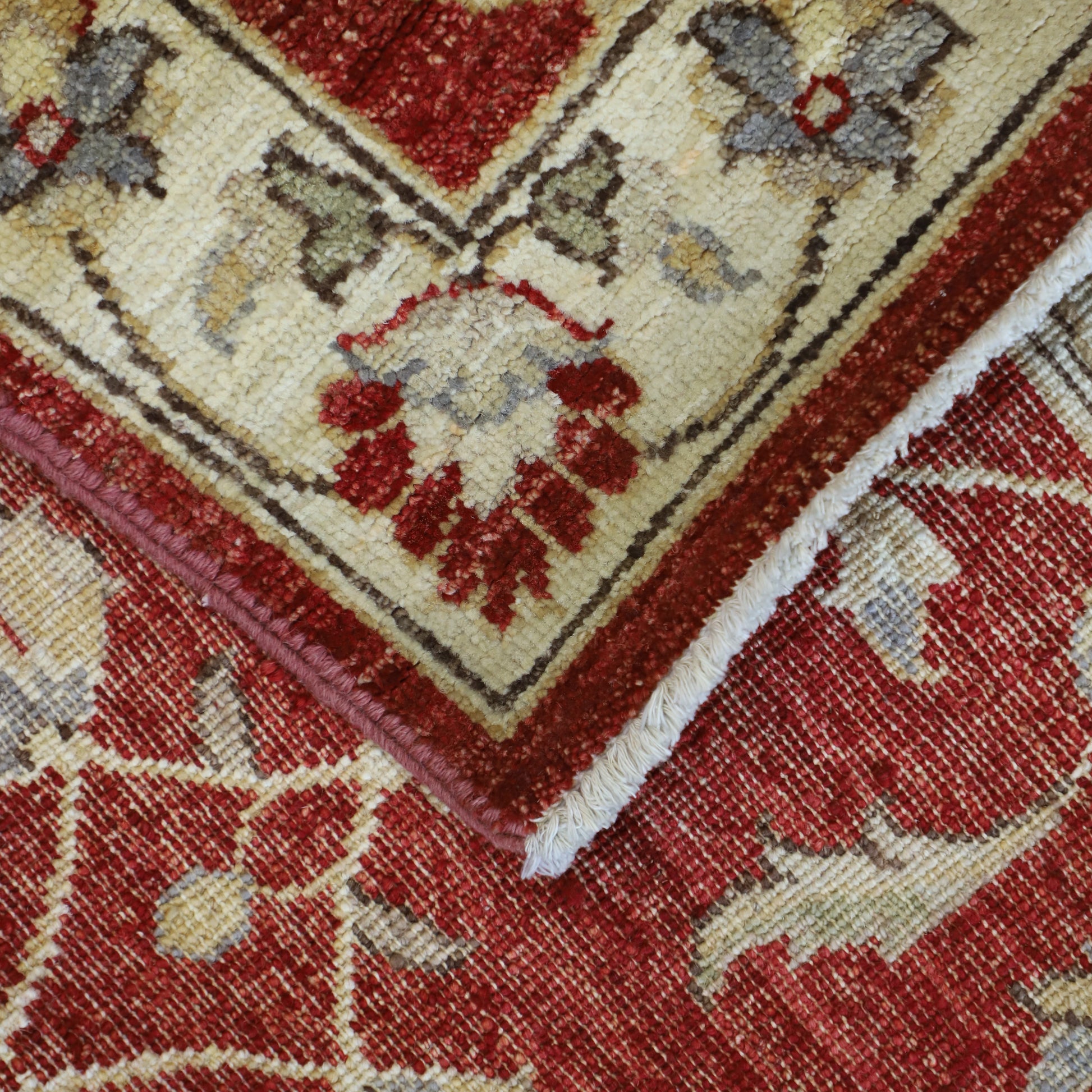 With its ivory-toned border and crimson red base, this handcrafted rug has a highly smooth texture that radiates modern elegance and subtle luxury.
