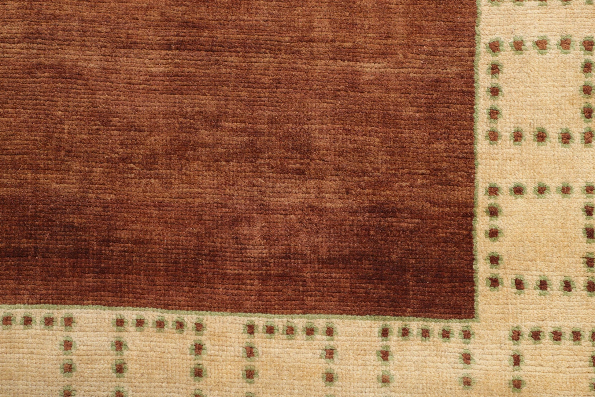 Like autumn leaves resting on soft earth, This reddish-brown rug with skin-tone rectangles and dotted accents gives your room a timeless appeal and a pure, grounded beauty.