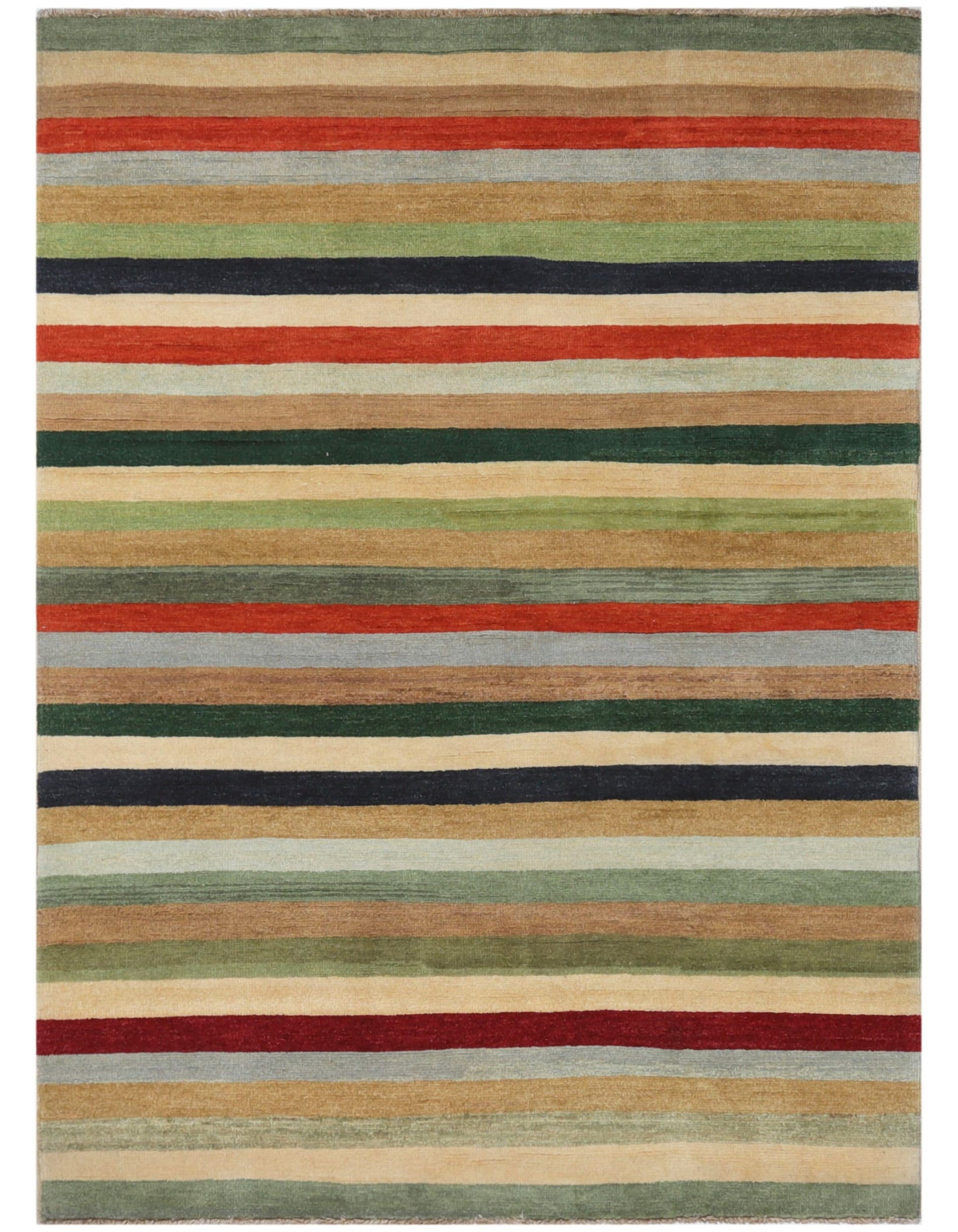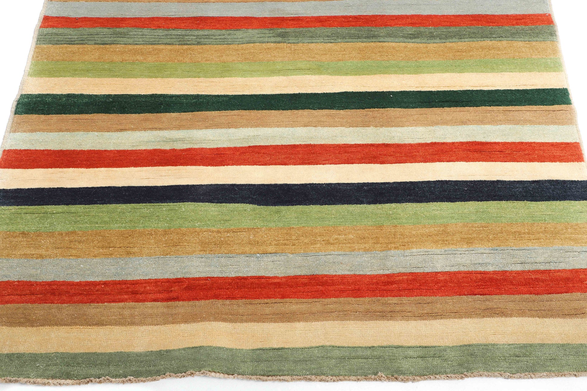 This multicolored handmade rug is an outstanding way to add a comfortable touch and brighten up any space with its cheerful colors and horizontal design.