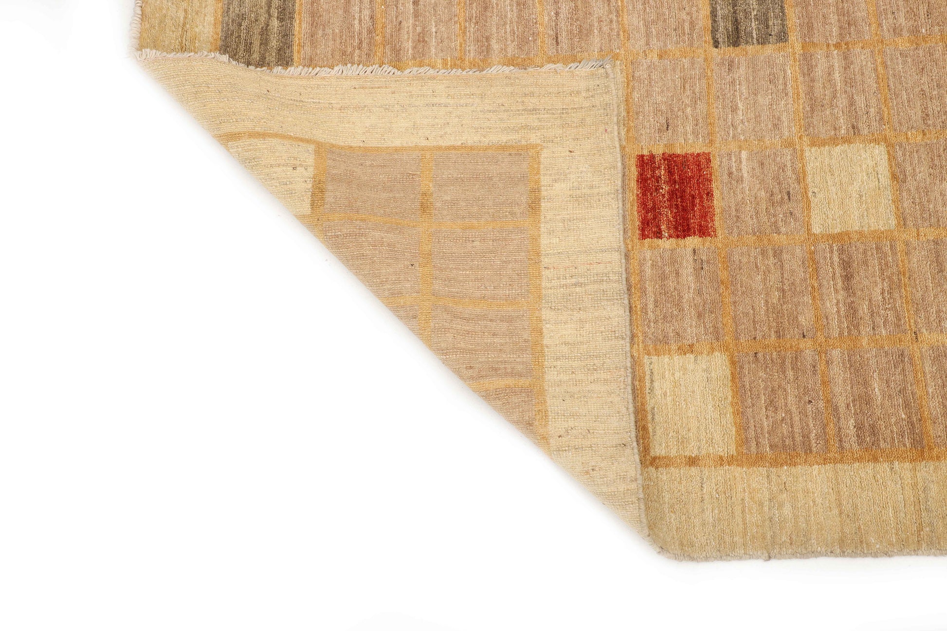 Like a gentle sunset over desert sands, with traces of deep crimson and a skin-toned border, this camel-brown handcrafted rug adds a subtle warmth that gives any room with a sense of grounded beauty