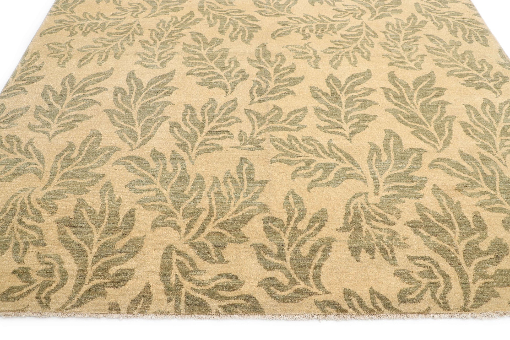 The skin-toned background of this handmade rug beautifully contrasts with its lively green leaf pattern ,giving any decor an elegant look.