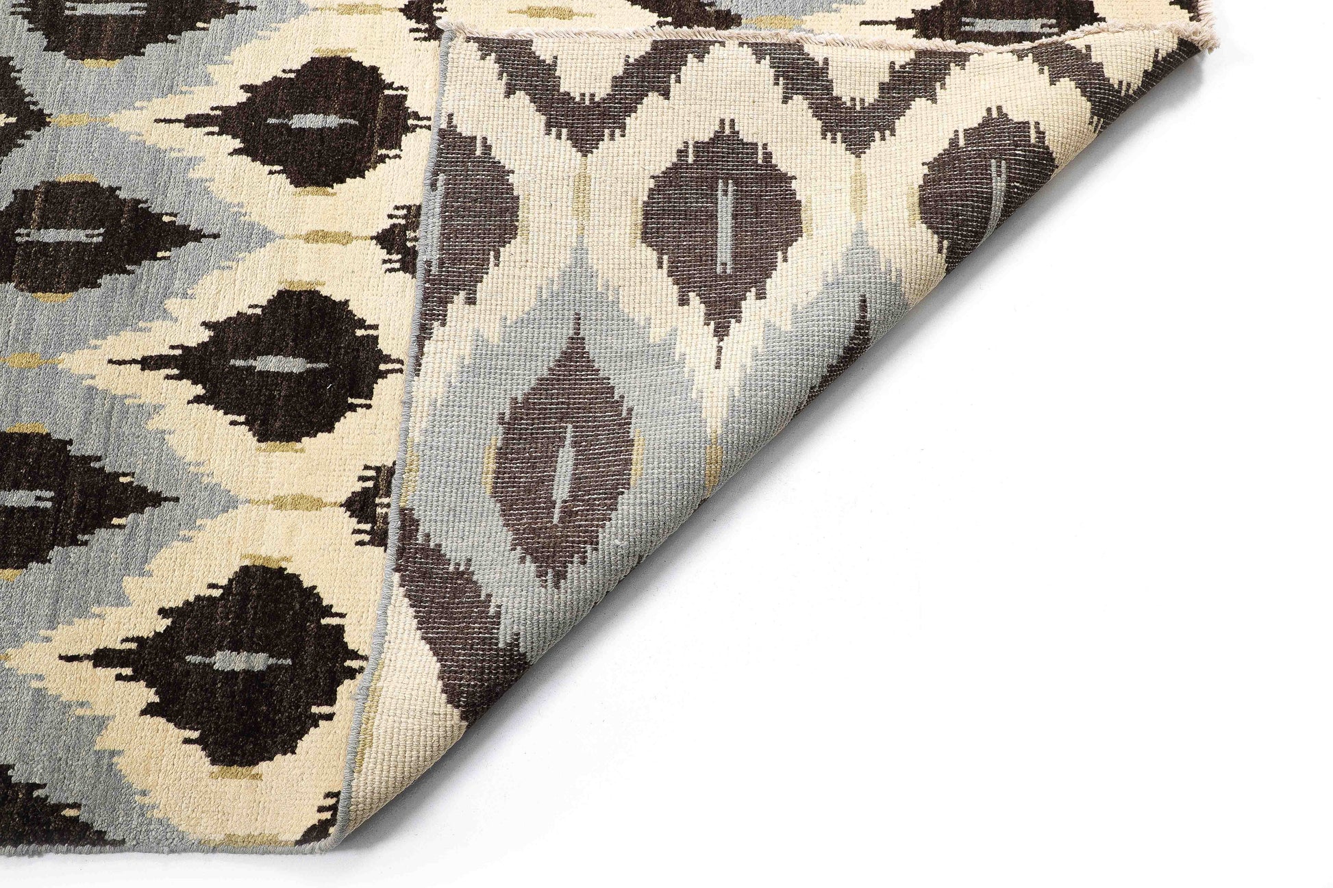 Handmade ivory carpet with black hints, featuring a striking geometric design—crafted for timeless elegance in your home.
