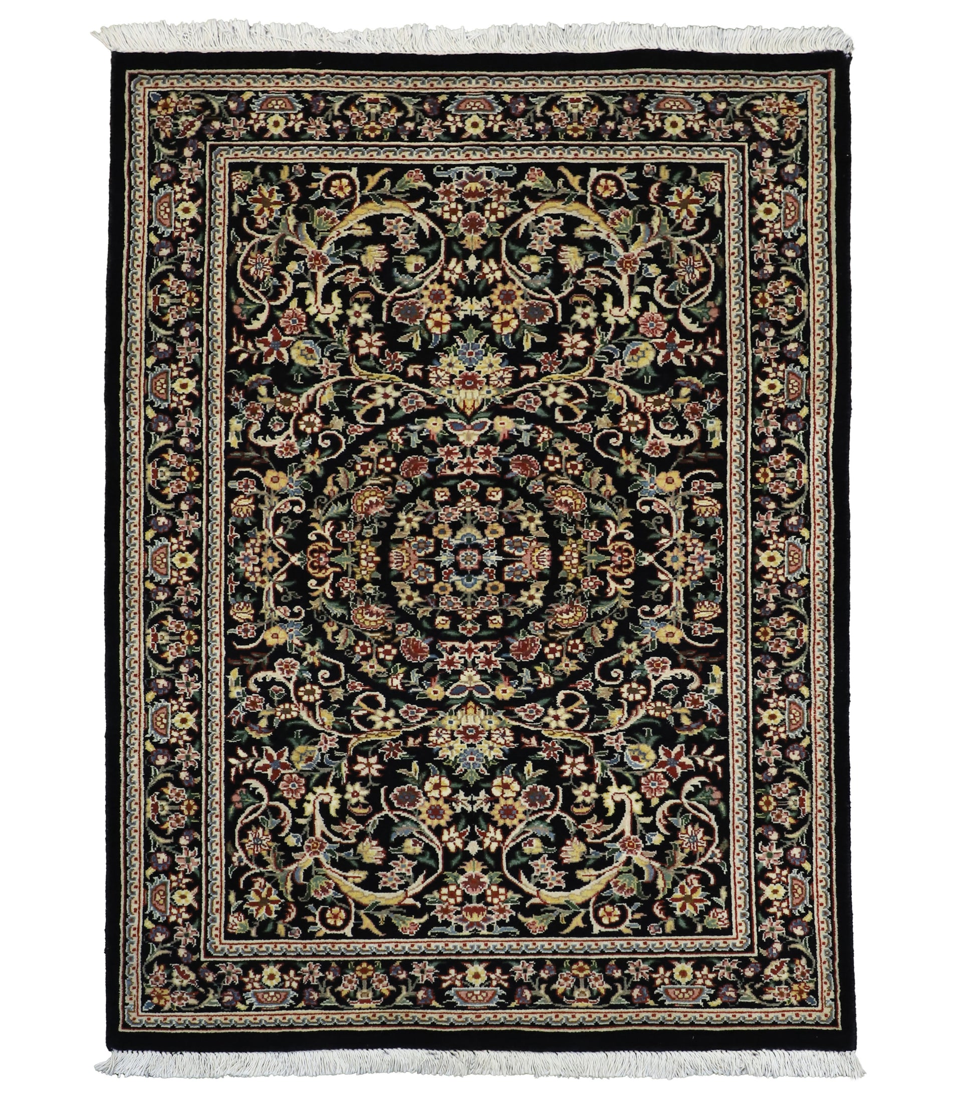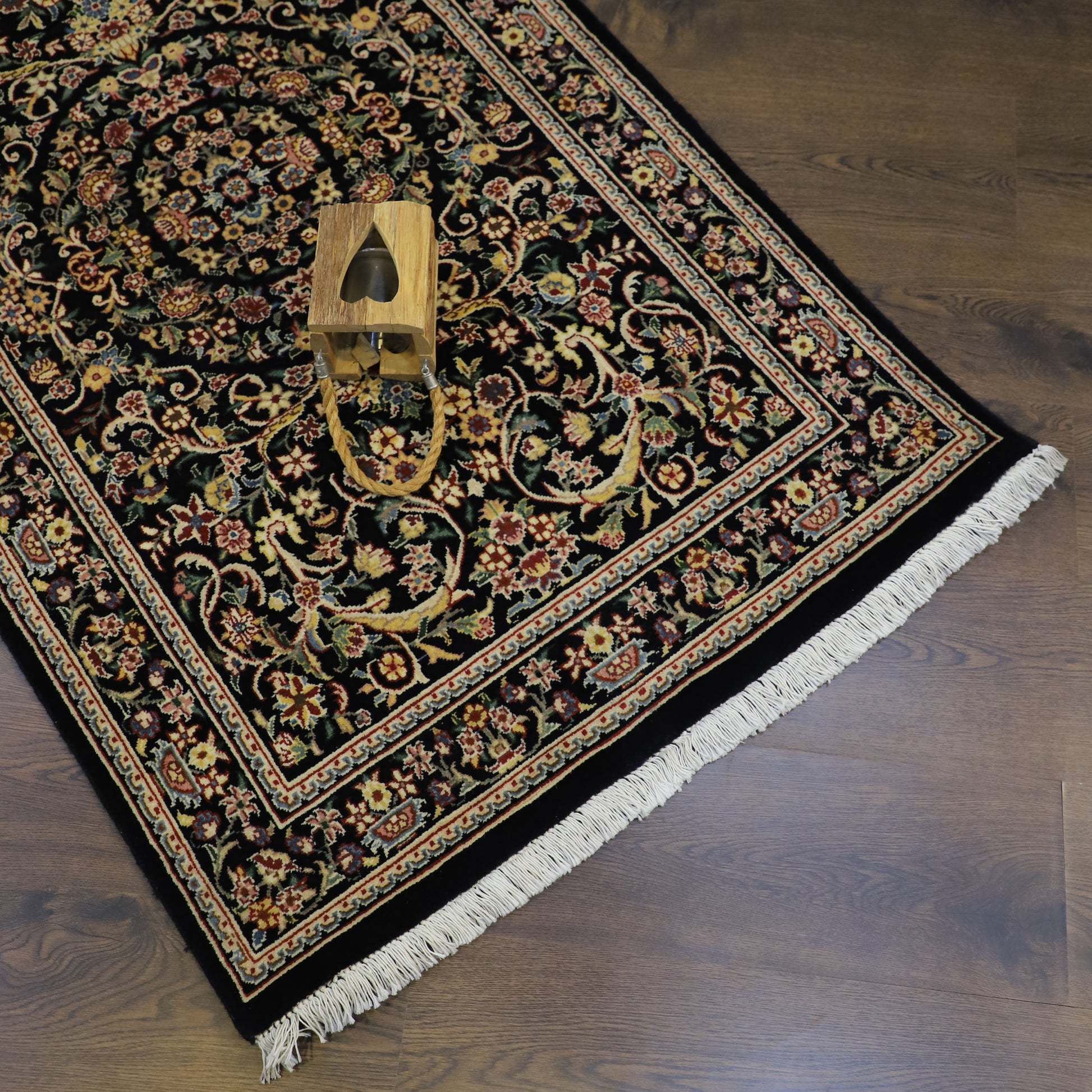 A stylish handwoven traditional-style rug in black with an ivory pattern and gentle multicolor textures, perfect for a luxurious touch in your space.