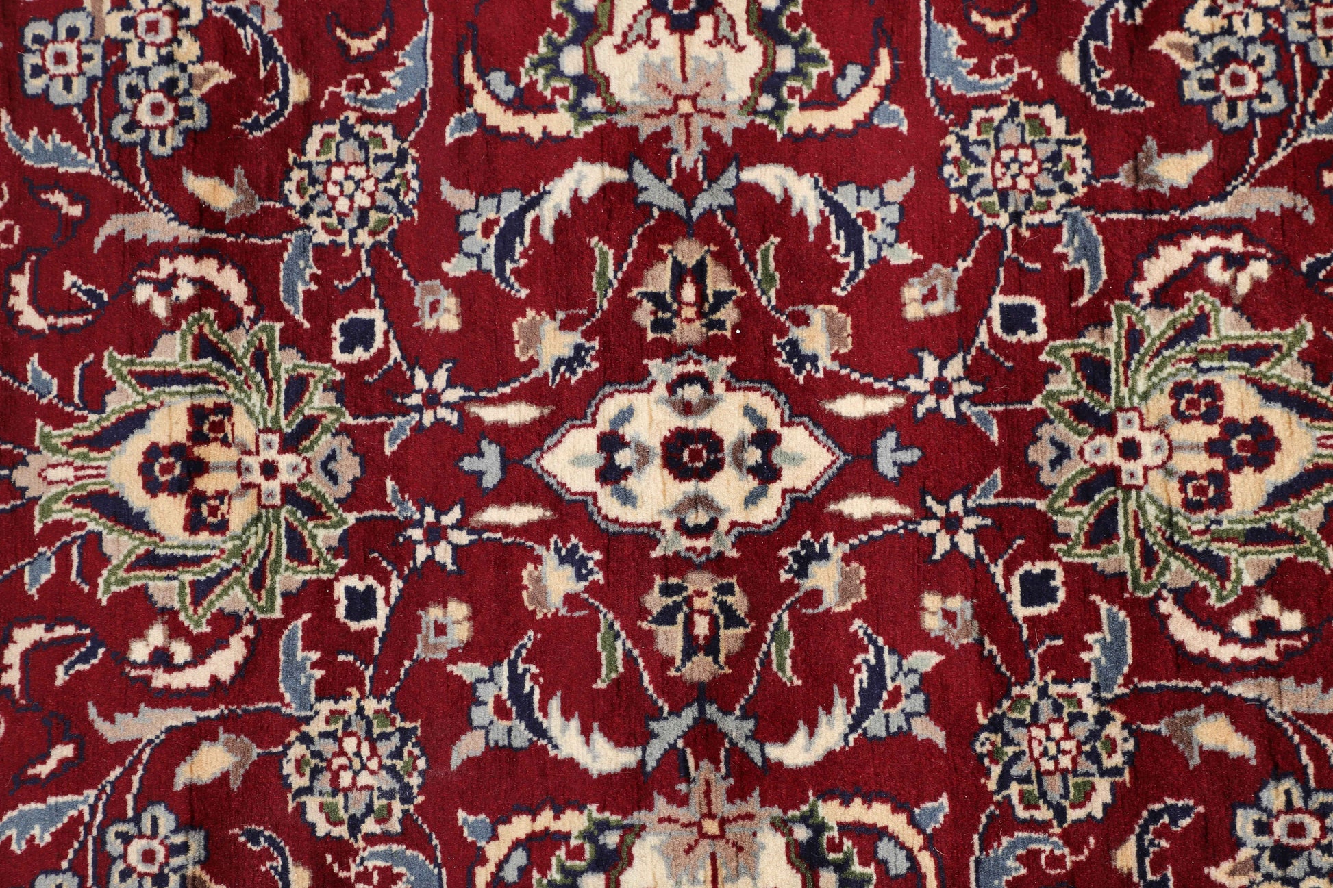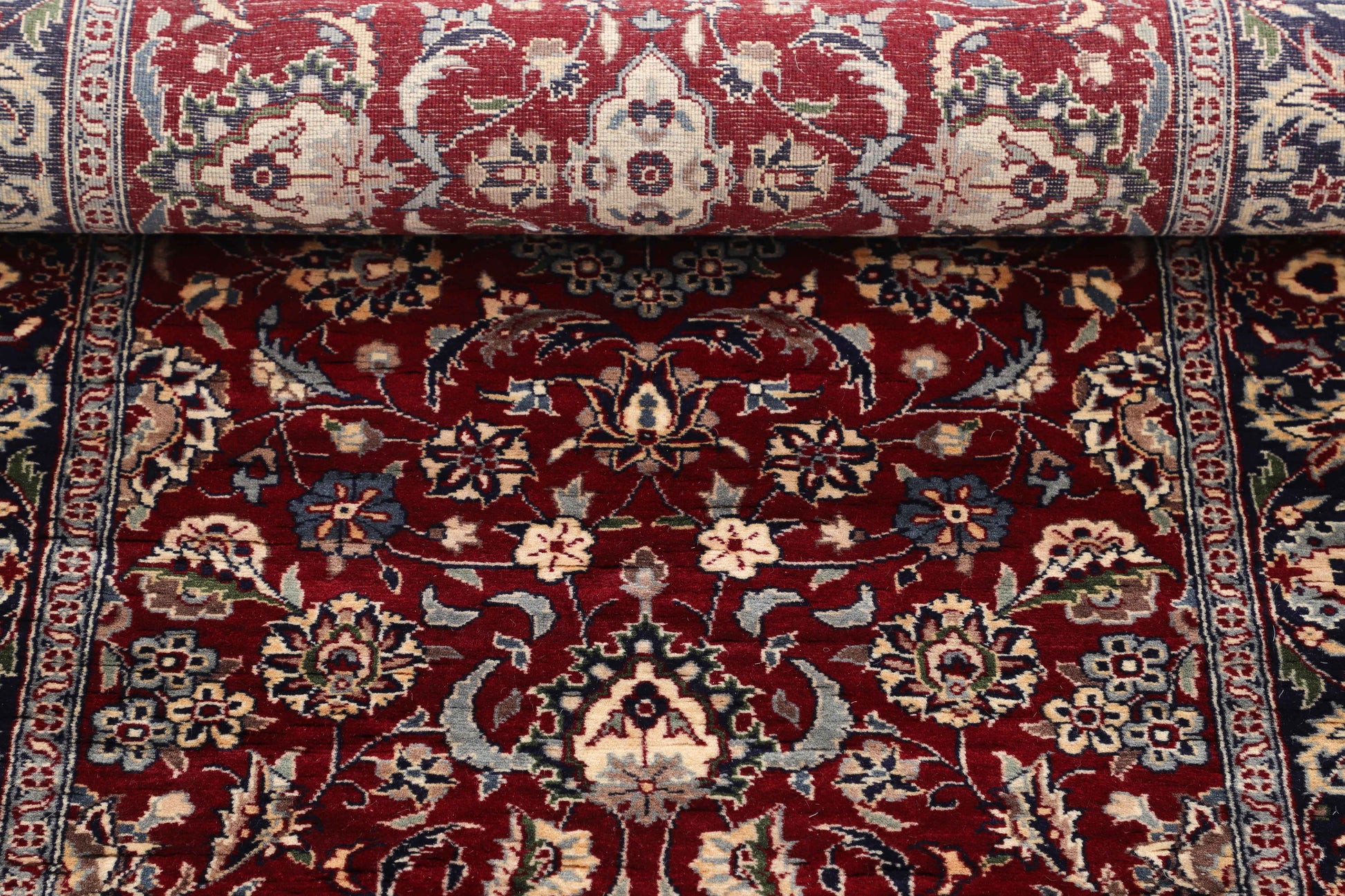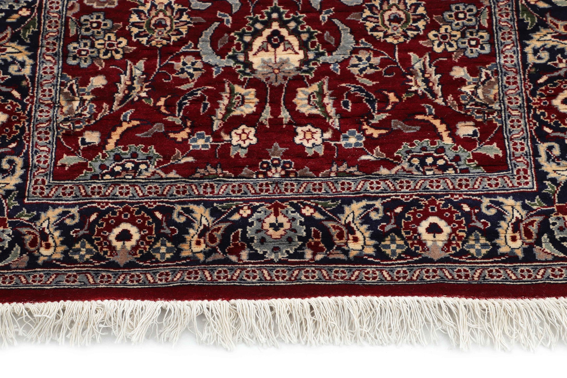 Your space will look effortlessly regal with this crimson-red traditional rug, framed by a navy blue border and intricate ivory textures that add a timeless elegance.