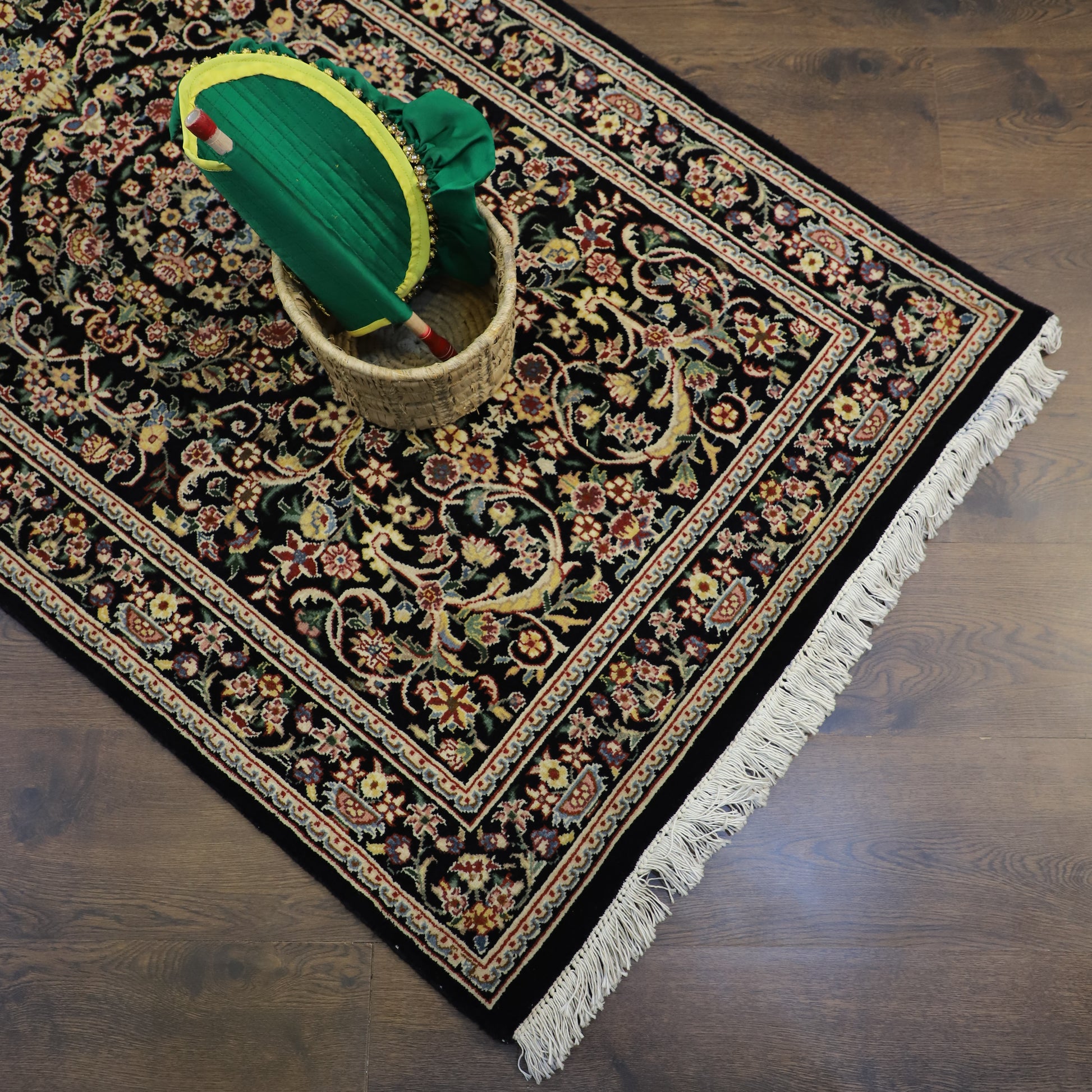 This handmade traditional-style rug in rich black and soft ivory with touches of red creates a timelessly classy accent for any space.
