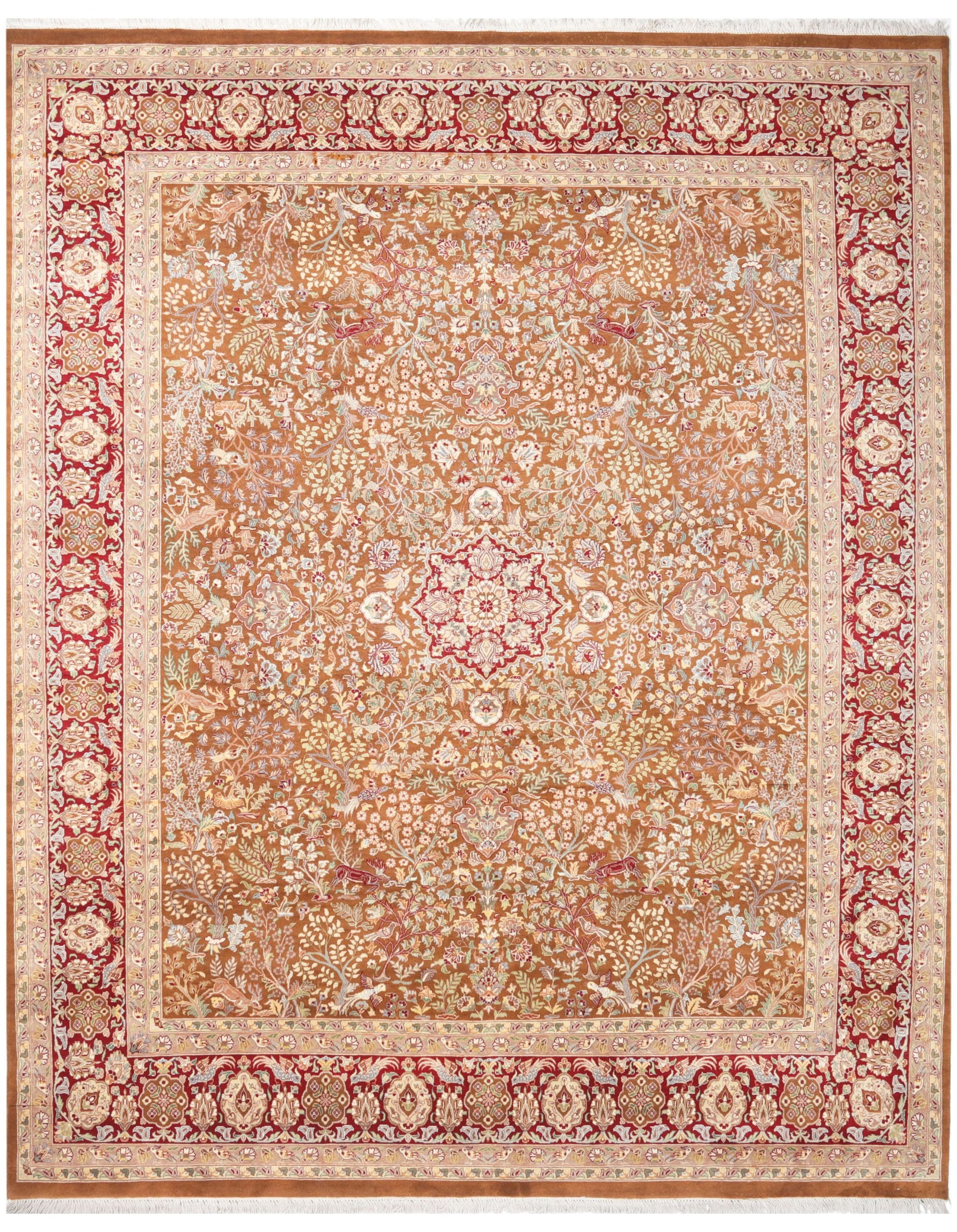 Add a touch of luxury to your home with this traditional rug, combining a camel brown center, striking crimson red border, and delicate ivory detailing for a classic look.