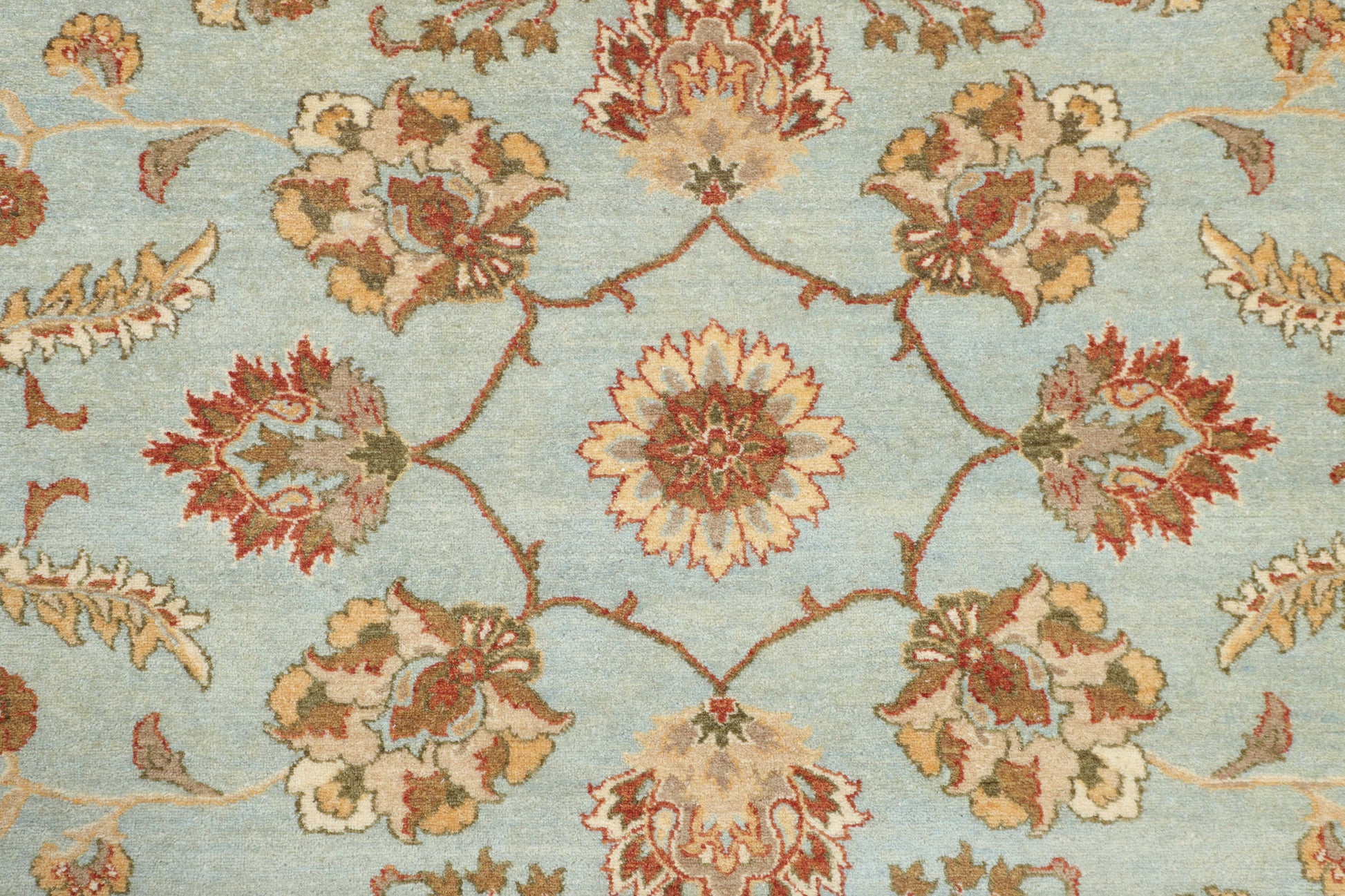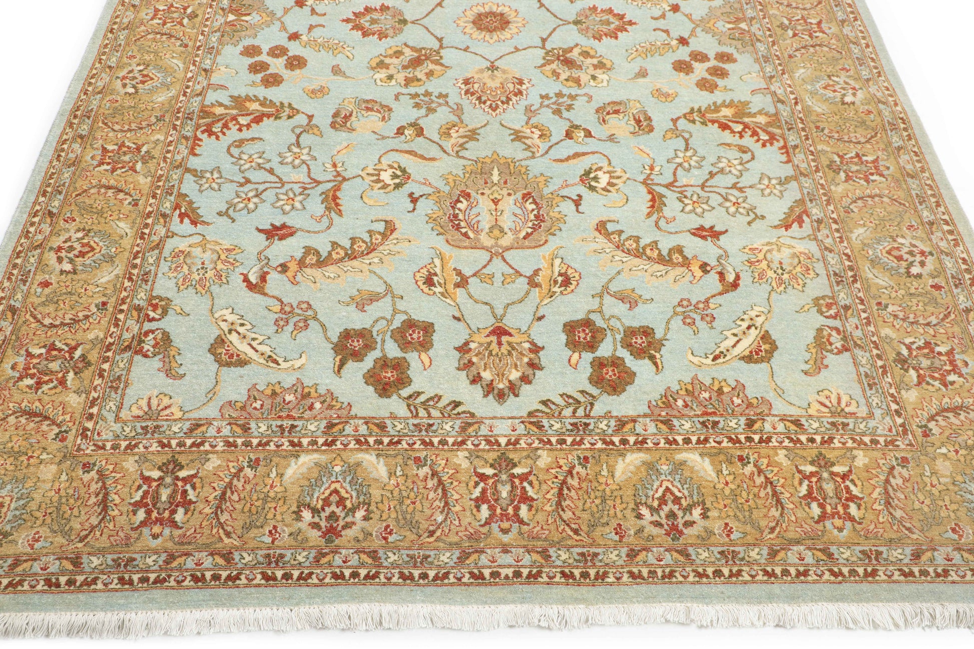 Your room will feel peaceful and refined with this handmade traditional rug, featuring a light blue core, ivory border, and soft camel brown essence.